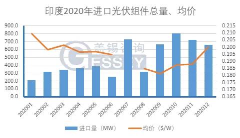 蓋錫咨詢(“GESSEY”),作為權威的全球新能源咨詢平臺,長期致力于新能源市場數據的收集、分析、反饋,提供及時有效準確的太陽能光伏行業資訊。其最新報告顯示,2020年,印度全年進口光伏組件5.7GW,其中12月進口總量656.7MW,12月進口均價0.200$/W。