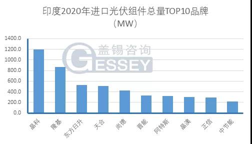 根據報告數據,2020全年,在印度流通光伏組件品牌以全球知名光伏組件品牌為主。其中,晶科、隆基、東方日升、天合、尚德位列印度全年進口光伏組件總量TOP5。晉能、阿特斯、晶澳、正信、中節能處于印度光伏組件出貨量第二梯隊,分列6至10名。TOP10企業占印度全年組件進口總量的87%,頭部效應顯著。