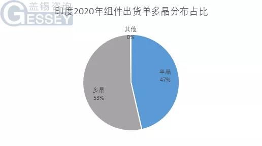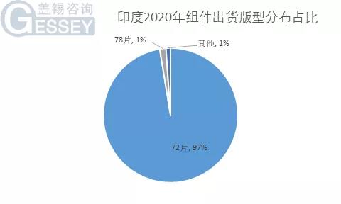 蓋錫數據顯示,截至2020年末印度市場光伏組件出貨量中,多晶組件占比53%,72片組件占比97%,330W,335W,405W位列功率占比前三名。多晶大版型在印度市場仍然占據較大比例。