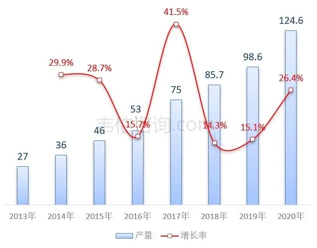 圖表1:2013-2020年中國光伏組件產量及增速(GW,%)