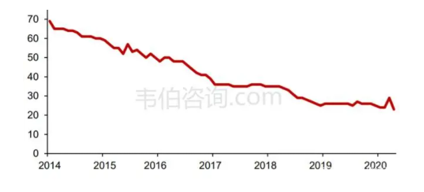 圖表2:2014-2020年中國光伏組件出口單價變化(美分/瓦)