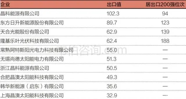 根據《中國海關》雜志2020年4月刊公布數據顯示,多家光伏企業躋身2019年出口前200強。如果將各個子公司的出口進行合并,我國光伏企業躋身出口200強的數量會更多,排名會更靠前。其中,出口額前十名的光伏組件企業如下表所示。