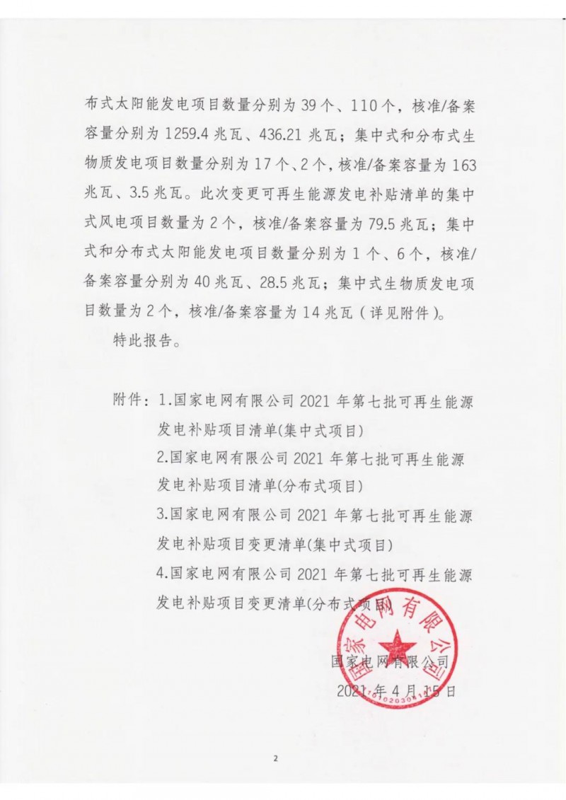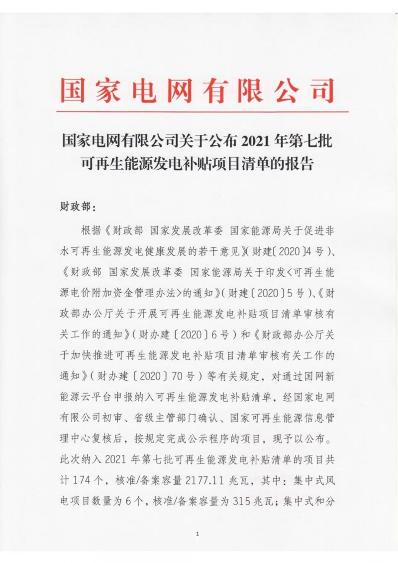 2021年4月15日,我公司已將完成公示的2021年第七批可再生能源發電項目補貼項目清單上報國家主管部門,第七批項目清單及后續項目審核進展情況,請登錄新能源云平臺查詢。