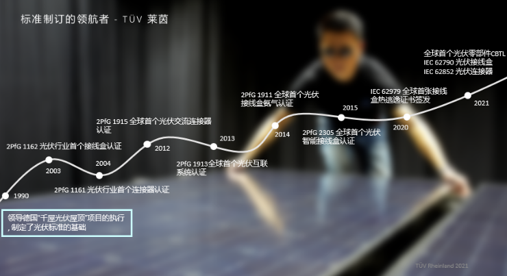 TÜV萊茵光伏零部件技術(shù)專家團(tuán)隊(duì)通過與光伏企業(yè)及標(biāo)委會的緊密合作,深耕數(shù)十載,基于自身多年的研究探索經(jīng)驗(yàn),以及對長期試驗(yàn)結(jié)果的分析,制定了多個光伏零部件相關(guān)的標(biāo)準(zhǔn),包括光伏接線盒,光伏連接器,光伏線纜等,這些標(biāo)準(zhǔn)被全球范圍內(nèi)的制造商和用戶廣泛認(rèn)可和采納。TÜV萊茵以強(qiáng)大的技術(shù)實(shí)力和權(quán)威性為國內(nèi)外光伏零部件企業(yè)進(jìn)入全球市場提供檢測認(rèn)證服務(wù),在引領(lǐng)及規(guī)范行業(yè)發(fā)展的路上,取得了多項(xiàng)具有里程碑意義的時(shí)刻。