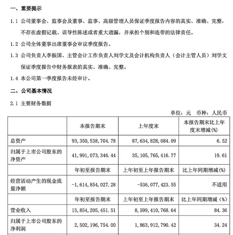 核心提示:隆基股份:第一季度凈利潤25.02億,同比增長34.24%