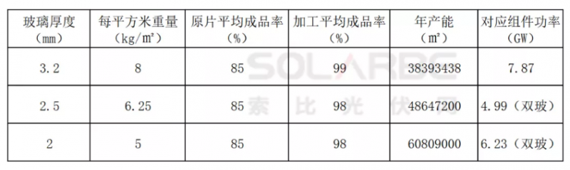 對于一個日融化量1000噸的玻璃窯爐,生產3.2mm、2.5mm、2.0mm三種厚度的光伏玻璃,產能產量情況見下表:
