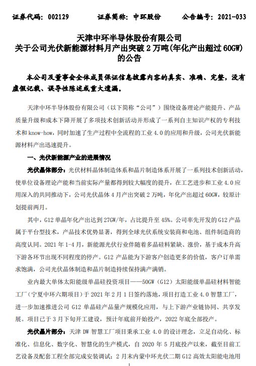 公告指出,目前G12單晶年化產出達到27GW/年,占比提升至45%。今年1-4月,新能源光伏行業伴隨著多晶硅料緊缺、漲價,下游各環節出現不同程度的停產。G12產品能為下游客戶創造更多的價值,客戶訂單需求飽滿,公司光伏晶體制造和硅片制造持續保持滿產滿銷。與此同時,業內最大單體太陽能級單晶硅投資項目——50GW(G12)太陽能級單晶硅材料智能工廠(寧夏中環六期項目)已于3月下旬開工建設,預計年底前開始投產,2022年底全部投產。