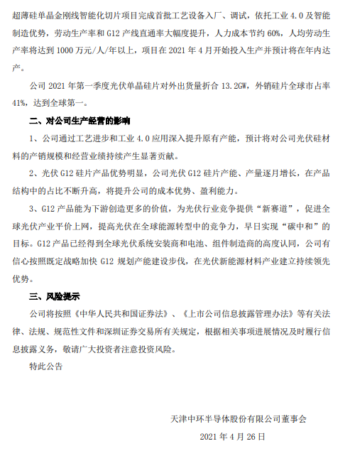 公告強調,隨著產能不斷提升,預計將對公司光伏硅材料的產銷規模和經營業績持續產生顯著貢獻。同時,考慮到G12硅片產品優勢明顯,公司G12硅片產能、產量逐月增長,在產品結構中的占比不斷升高,將提升公司的成本優勢、盈利能力。公司有信心按照既定戰略加快G12規劃產能建設步伐,在光伏新能源材料產業建立持續領先優勢。
