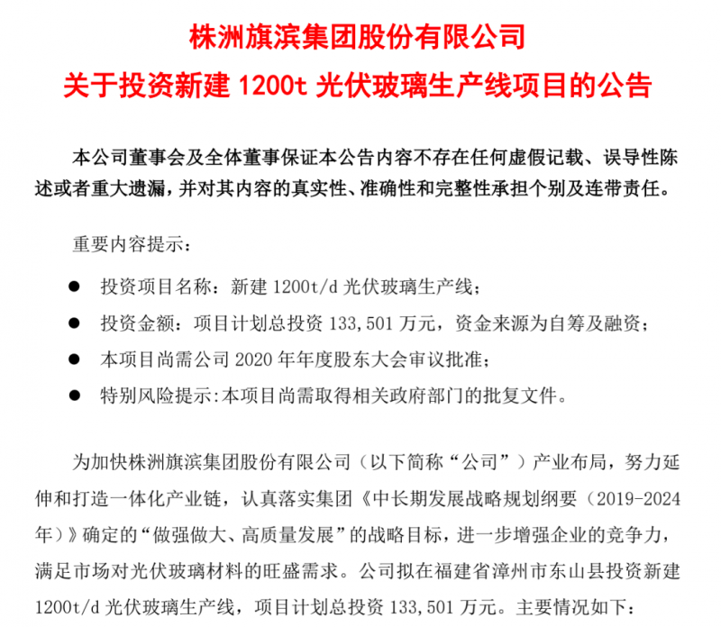 公告顯示,旗濱集團擬在福建省漳州市東山縣投資新建1200t/d 光伏玻璃生產(chǎn)線,項目計劃總投資133,501萬元。