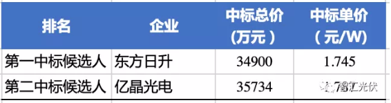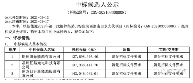 項目2:中廣核陜西渭南白水光伏項目總規(guī)模80MW,供貨期為2021年7月1日~8月31日。第一中標候選人:錦州陽光,投標報價137698246.4元,單價1.721元/W;第二中標候選人:億晶光電,投標報價137938417.76萬元,單價1.724元/W;第三中標候選人:東方日升,投標報價143046062.01萬元,單價1.788元/W。
