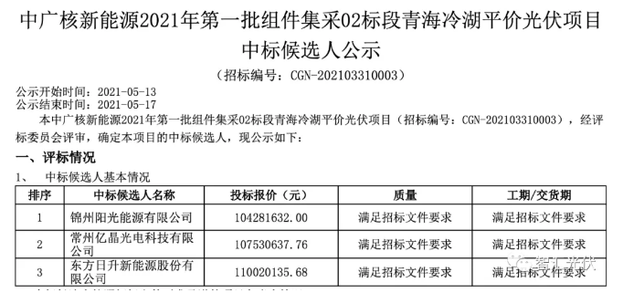 中標公示日期:2021年5月7日招標量:1.71元/WMW(535W及以上)中標結(jié)果:
