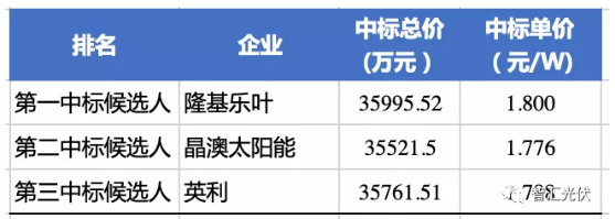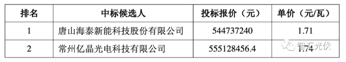 中標公示日期:2021年5月7日第一中標人:合肥晶澳太陽能科技有限公司中標總價:199538671.8元,折合單價:1.735元/W