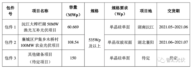 項目1:廣東省電力開發(fā)有限公司2021年第二批光伏組件采購,共3個項目,總規(guī)模為200MW,分別為:葵潭項目:60MW,供貨期:8月-10月織篢項目:80MW,供貨期:6月-10月公莊項目:60MW,供貨期:6月-9月