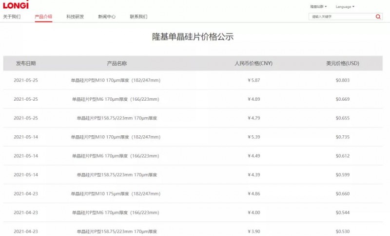5月14日,隆基股份更新硅片價格。其中,G1報價4.39元/片,較4月23日公示價格提高0.49元,漲幅為12.56%;M6報價4.49元/片,上漲0.49元,漲幅為12.25%;M10報價5.39元/片,上漲0.53元,漲幅為10.9。今年以來,隆基股份已5次上調硅片價格。