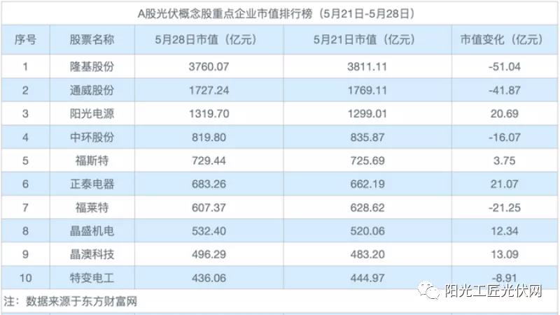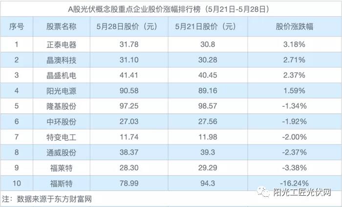 本周,10家光伏企業股價跌幅超5%僅福斯特1家,5月28日收盤報價對比上周跌16.24%。