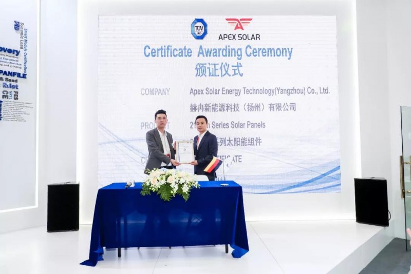 中國/上海 ,6月3日,在第十五屆(2021)國際太陽能光伏與智慧能源(上海)展覽會暨論壇期間, TÜV南德意志大中華集團(tuán)(以下簡稱“TÜV 南德”)為赫冉新能源科技(揚(yáng)州)有限公司(以下簡稱“赫冉新能源”)所展出的210單玻產(chǎn)品頒發(fā)TÜV 南德認(rèn)證證書。TÜV南德智慧能源高級運(yùn)營總監(jiān)以及首席簽證官張祝林、赫冉新能源董事長陳建輝等一席嘉賓出席了該頒證儀式。
