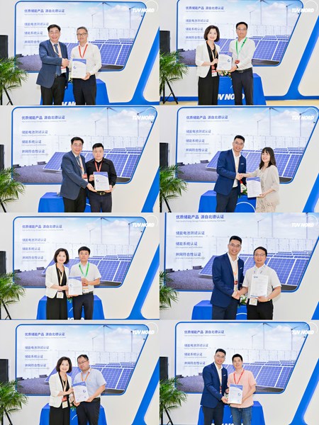 3日上午,TUV北德亞太區首席執行官兼大中華區董事長任駿先生在TUV北德展臺發表致辭。隨后,TUV北德先后為橫店集團東磁股份有限公司頒發全球首張光伏組件耐酸性鹽霧認證證書,為諾斯曼能源科技(北京)股份有限公司頒發全球首張漂浮光伏電站用HDPE浮體產品認證證書,為四川科陸新能電氣有限公司頒發2MW儲能PCS安規認證證書,為江蘇日托光伏科技股份有限公司頒發柔性晶硅光伏組件IEC 61215、IEC 61730認證證書,為廣東金源光能股份有限公司頒發晶硅光伏組件IEC 61215 2021版新標準認證證書,為麥田能源有限公司頒發儲能一體機意大利并網認證證書,為東方日升新能源股份有限公司頒發光伏組件意大利1級防火證書,為湖南紅太陽新能源科技有限公司頒發182光伏組件IEC 61215、IEC61730認證證書。