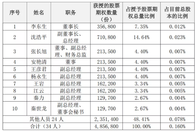 中環股份股票期權在各激勵對象間的分配情況如下表所示: