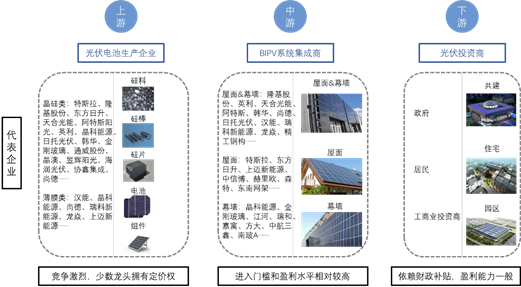 目前,我國BIPV產(chǎn)業(yè)鏈已經(jīng)形成上游光伏電池生產(chǎn),中游系統(tǒng)集成以及下游包括包括政府、居民、工商業(yè)用戶等投資商的產(chǎn)業(yè)鏈體系。