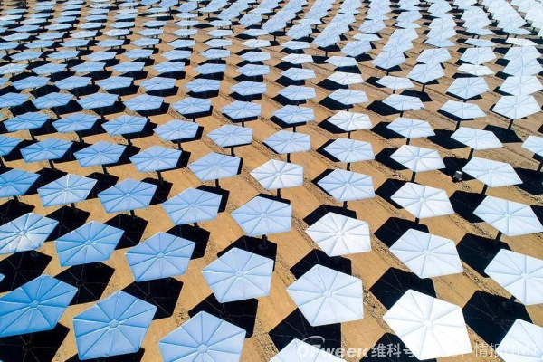 6月中旬,新疆哈密伊吾縣淖毛湖鎮,14500面定日鏡完成安裝調試,新疆首個光熱電站進入穩定發電期。從空中俯瞰,14500面定日鏡像是一個巨大的“銀色向日葵田”,場面十分壯觀。該項目可實現年供電量1.98億度,每年可節約標煤6.19萬噸。
