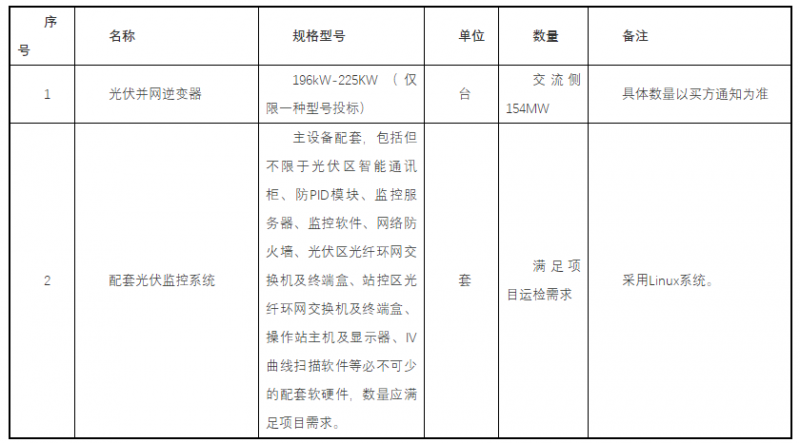 供貨范圍包括但不限于組串式逆變器設備、光伏區智能通訊柜、防PID模塊、監控服務器、監控軟件、網絡防火墻、光伏區光纖環網交換機及終端盒、站控區光纖環網交換機及終端盒、操作站主機及顯示器、IV曲線掃描軟件等必不可少的配套軟硬件、其所有附屬設備和附件、備品備件、專用工具,以及相關服務等詳細范圍及主要技術參數詳見技術規范書。