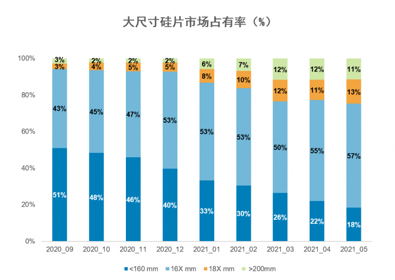從2020年9月起,大尺寸硅片(>160mm)的市場份額從49%增加到了82%;