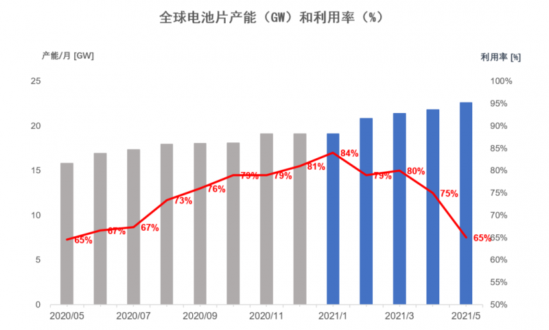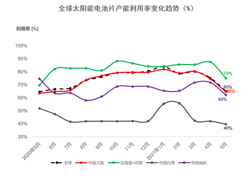 2021年5月,由于硅片緊缺、開工率不足、終端需求疲軟等因素,全球太陽能電池片產能利用率進一步下降,目前產能利用率保持在65%左右。