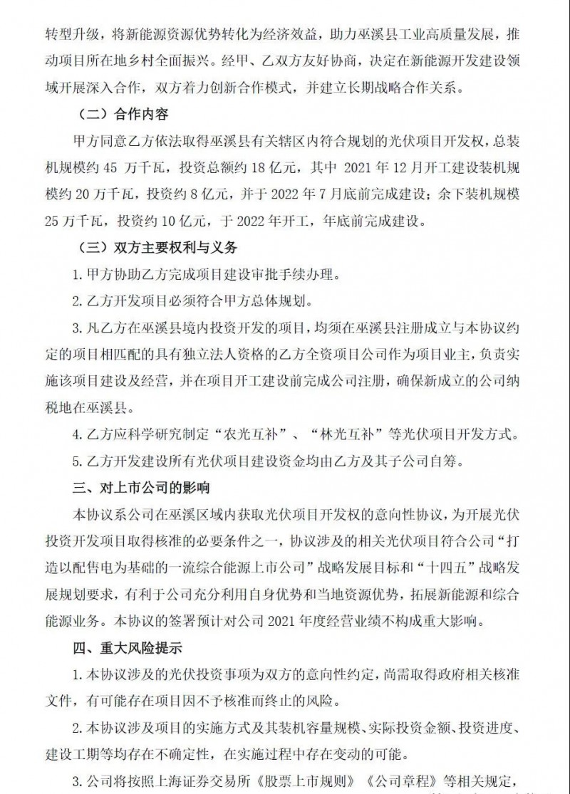 光伏產業屬于新能源業務板塊。根據公司《“十四五”(2021-2025)戰略發展規劃(綱要)》,“十四五”期間,公司將積極打造新能源開發運營平臺,以協同三峽集團新能源產業為主,探索新能源業務“差異化”發展之路。公司將以“自營”和“新能源項目增值服務”為重要方向發展新能源業務,對于與公司配售電產業協同程度高、互補性強、效益促進作用明顯的新能源項目采用自營方式經營,同時通過開展市場資源開發、工程建設/BT服務、運維服務、儲能解決方案等增值服務參與其他新能源項目服務。