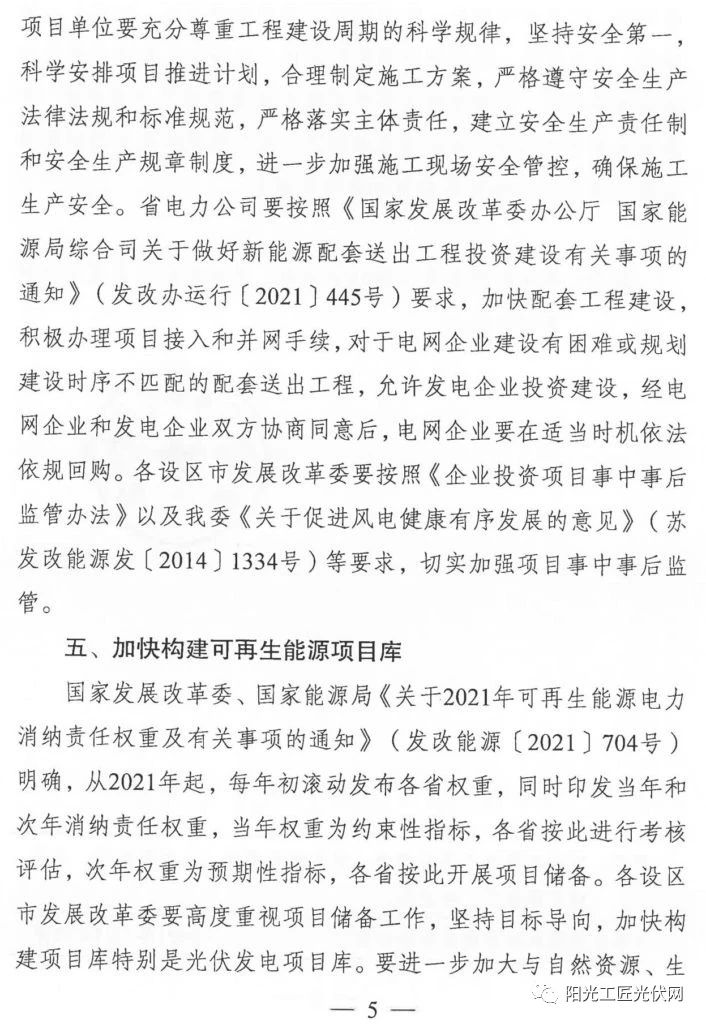 項目單位要充分尊重工程建設周期的科學規律,堅持安全第一,科學安排項目推進計劃,合理制定施工方案,嚴格遵守安全生產法律法規和標準規范,嚴格落實主體責任,建立安全生產責任制和安全生產規章制度,進一步加強施工現場安全管控,確保施工生產安全。省電力公司要按照《國家發展改革委辦公廳 國家能源局綜合司 關于做好新能源配套送出工程投資建設有關事項的通知》(發改辦運行〔2021〕445號)要求,加快配套工程建設,積極辦理項目接入和并網手續,對于電網企業建設有困難或規劃建設時序不匹配的配套送出工程,允許發電企業投資建設,經電網企業和發電企業雙方協商同意后,電網企業要在適當時機依法依規回購。各設區市發展改革委要按照《企業投資項目事中事后監管辦法》以及我委《關于促進風電健康有序發展的意見》(蘇發改能源發〔2014〕1334號)等要求,切實加強項目事中事后監管。