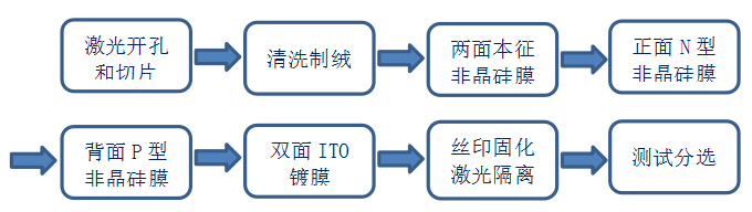 根據(jù)測算,硅片厚度每降低10μm,單片硅片成本將降低3%~5%,這個對于價格高昂的N型硅片極為重要,但是薄片化帶來的挑戰(zhàn)也非常大,常規(guī)的焊帶高溫焊接的方式嚴重制約了硅片厚度的持續(xù)下降,所以目前量產(chǎn)最多只能降低到160μm左右,進一步的硅片減薄必須采用更先進的無應(yīng)力互聯(lián)封裝方式,而MWT技術(shù)恰恰提供了完美的解決方案。所以HJT+MWT電池采用120μm甚至更薄的超薄硅片,只需要增加激光開孔和隔離工序即可。其工藝流程如下圖所示: