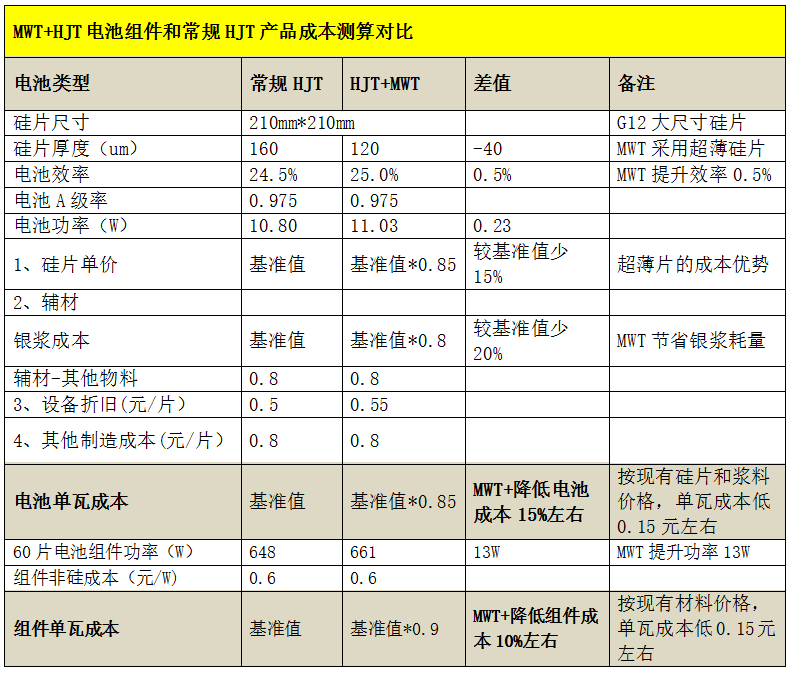 低成本,MWT+HJT成本測算