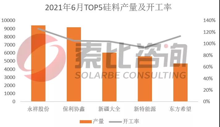 繼2020年4月份硅料產(chǎn)量歷史新高后,2021年6月份硅料產(chǎn)量再創(chuàng)新高,產(chǎn)量4萬噸(約14GW),環(huán)比增長3.5%,主要系永祥檢修產(chǎn)能優(yōu)化導(dǎo)致。TOP5產(chǎn)量總計(jì)3.5萬噸,占比87.2%,綜合開工率108.2%。