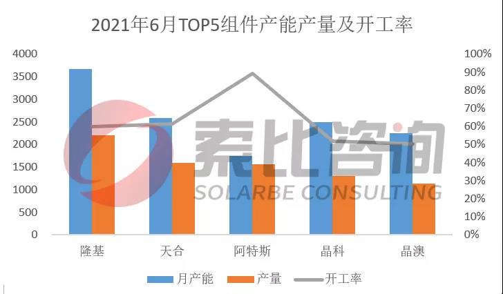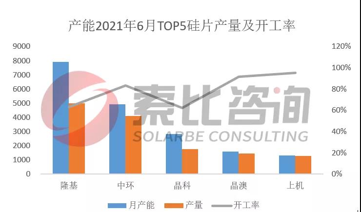 2021年6月份硅片產(chǎn)量17.73GW,環(huán)比下降5%。產(chǎn)量TOP5排序?yàn)槁』⒅协h(huán)、晶科、晶澳、上機(jī),總計(jì)13.6GW,占比76.6%,綜合開工率79.1%。