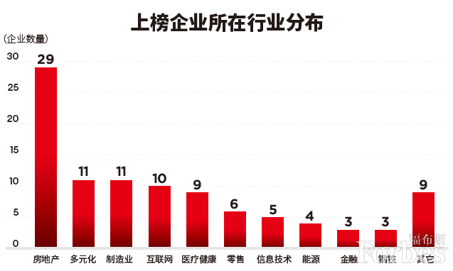 此外,從上榜企業的行業集中度(企業數量)來看,房地產、多元化和制造業名列前三。互聯網、醫療健康、零售、信息技術、能源、金融、鋼鐵行業位居于后。