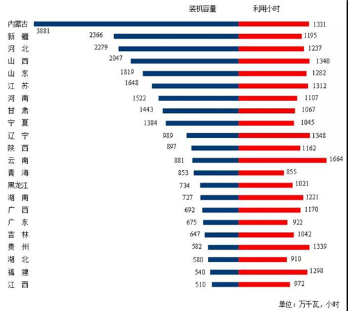 圖3 1-6月份風(fēng)電裝機(jī)較多省份風(fēng)電裝機(jī)容量和設(shè)備利用小時(shí)