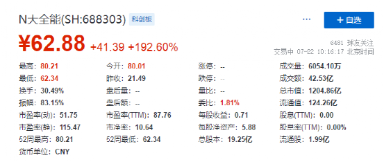 7月22日,大全新能源(N大全能 SH:688303)正式登陸上交所上市交易,并同時開始了上市儀式全程直播,開盤后股價暴漲273%,報80.21元。截止發稿,大全市值已經超過1200億,成為A股第7家千億市值光伏企業!其余千億光伏愜意還包括隆基股份、通威股份、陽光電源、中環股份、北方華創以及本月市值破千億的福斯特。