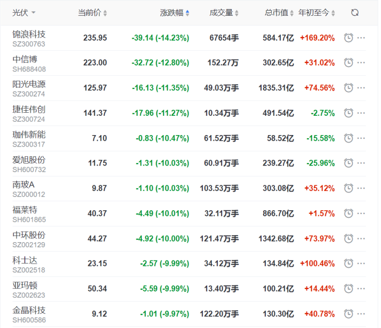 作為資本市場重要板塊,光伏行業(yè)很難置身事外,超80%光伏概念股今日出現(xiàn)下跌,電氣設(shè)備板塊整體跌幅5.79%。具體看,愛旭股份、南玻A、福萊特、中環(huán)股份、科士達、亞瑪頓、金晶科技等7只股票跌停,錦浪科技、中信博、陽光電源、捷佳偉創(chuàng)、珈偉新能等5只身處創(chuàng)業(yè)板、科創(chuàng)板的股票跌幅超過10%,超30只股票跌幅超過5%,就連光伏ETF(SH:515790)也罕見地出現(xiàn)6.98%下跌。