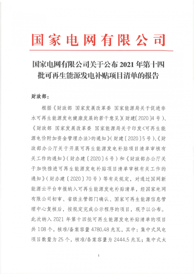 2021年7月31日,我公司已將完成公示的2021年第十四批可再生能源發電項目補貼項目清單上報國家主管部門,第十四批項目清單及后續項目審核進展情況,請登錄新能源云平臺查詢。