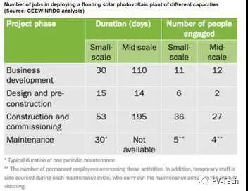 -一個小型漂浮式光伏(FPV)電站(產(chǎn)能<1MW)直接雇用了58名工人,而一個中等規(guī)模(產(chǎn)能<10MW)的電站在開發(fā)過程中雇用了45人。