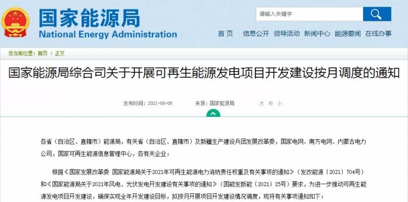 根據《國家發展改革委 國家能源局關于2021年可再生能源電力消納責任權重及有關事項的通知》(發改能源〔2021〕704號)和《國家能源局關于2021年風電、光伏發電開發建設有關事項的通知》(國能發新能〔2021〕25號)要求,為進一步推動可再生能源發電項目開發建設,確保實現全年開發建設目標,擬按月開展項目開發建設情況調度,現將有關事項通知如下:
