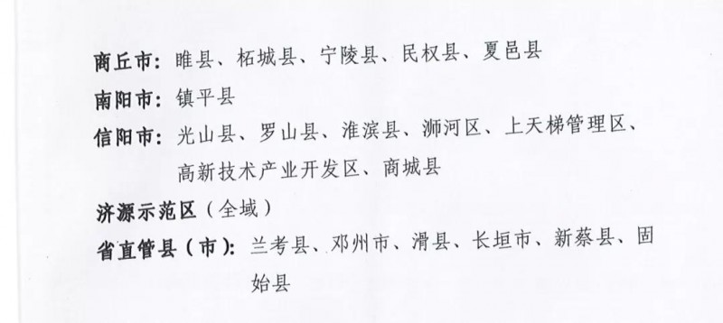 信陽市:光山縣、羅山縣、淮濱縣、浉河區(qū)、上天梯管理區(qū)、 高新技術(shù)產(chǎn)業(yè)開發(fā)區(qū)、商城縣