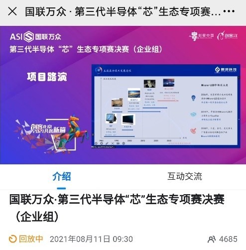 8月11日,第六屆“創客中國”中小企業創新創業大賽暨“創客北京2021”創新創業大賽·國聯萬眾·第三代半導體“芯”生態專項賽總決賽圓滿收官。因疫情防控要求,大賽以線上路演直播,線下評審形式開啟,吸引了眾多觀眾線上觀賽,最高在線觀賽人數規模達7000余人。大賽通過線上直播向廣大產業界朋友們展現了再大的困難也阻擋不了我們追尋創新創業的步伐。