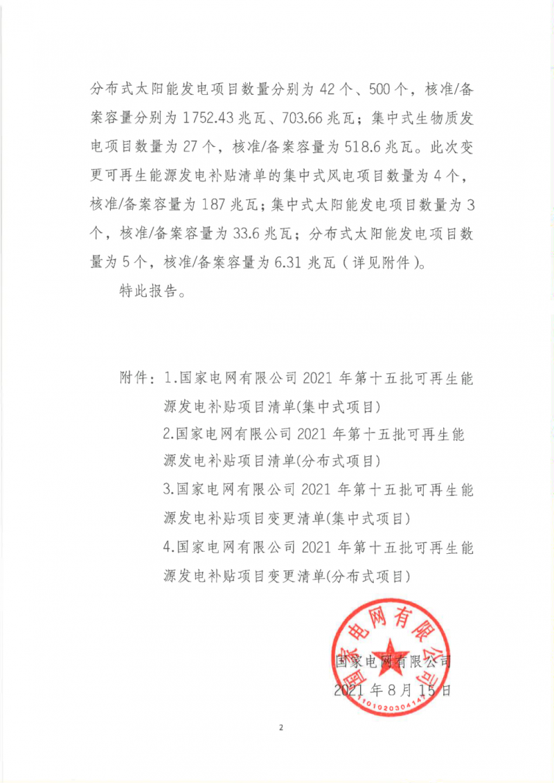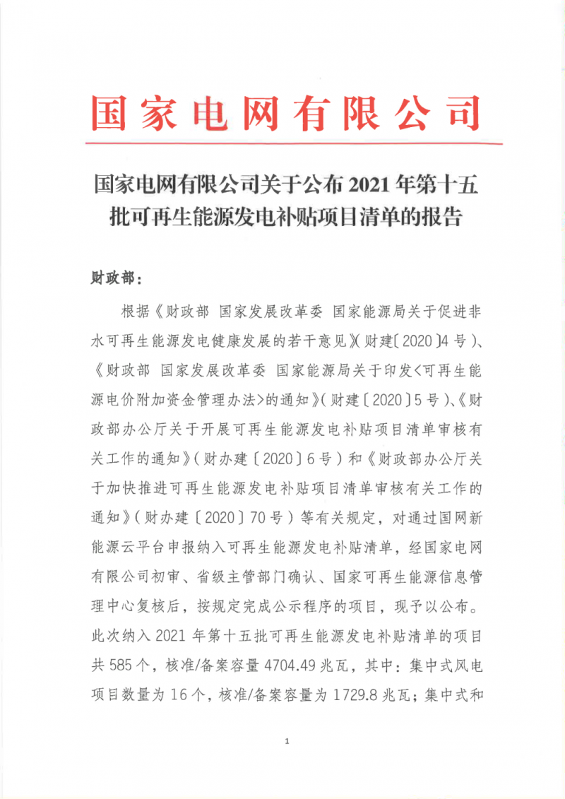 2021年8月15日,我公司已將完成公示的2021年第十五批可再生能源發電項目補貼項目清單上報國家主管部門,第十五批項目清單及后續項目審核進展情況,請登錄新能源云平臺查詢。