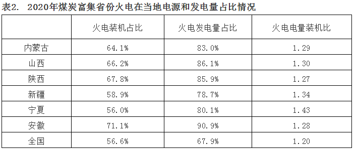 表2. 2020年煤炭富集省份火電在當地電源和發電量占比情況