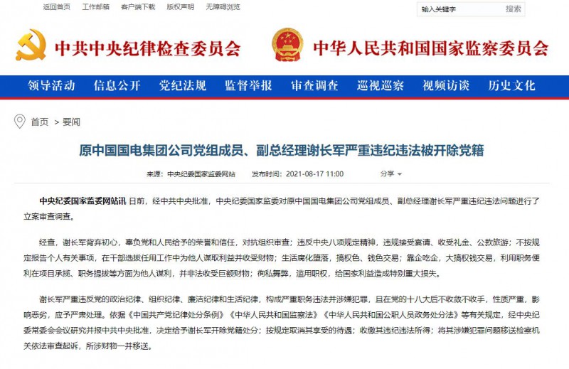 謝長軍嚴重違反黨的政治紀律、組織紀律、廉潔紀律和生活紀律,構成嚴重職務違法并涉嫌犯罪,且在黨的十八大后不收斂不收手,性質嚴重,影響惡劣,應予嚴肅處理。依據《中國共產黨紀律處分條例》《中華人民共和國監察法》《中華人民共和國公職人員政務處分法》等有關規定,經中央紀委常委會會議研究并報中共中央批準,決定給予謝長軍開除黨籍處分;按規定取消其享受的待遇;收繳其違紀違法所得;將其涉嫌犯罪問題移送檢察機關依法審查起訴,所涉財物一并移送。