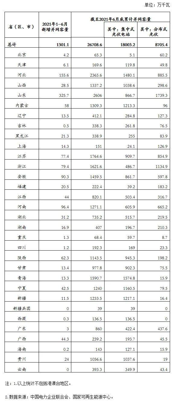 月18日,國家能源局發布2021年上半年全國光伏發電建設運行情況。詳情如下: