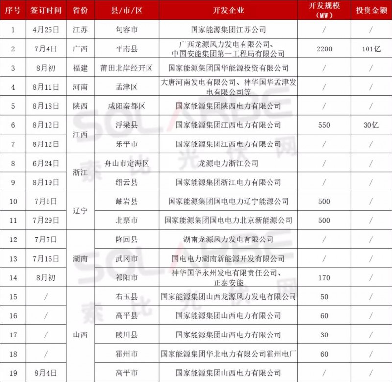 據索比光伏網統計,國家能源集團在8月份發布了24個分布式光伏項目EPC招標,裝機容量合計300MW,大多要求年底前并網。