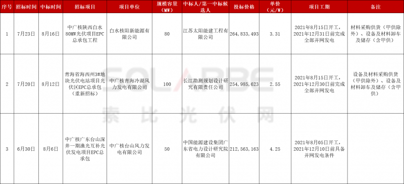 其中,中廣核陜西白水80MW光伏項(xiàng)目EPC總承包工程、青海省海西州3#地塊光伏電站項(xiàng)目光伏區(qū)EPC總承包(重新招標(biāo))兩個(gè)小EPC中標(biāo)價(jià)格為2.55元/W、3.31元/W,第一中標(biāo)候選人為江蘇太陽(yáng)能建工程有限公司、長(zhǎng)江勘測(cè)規(guī)劃設(shè)計(jì)研究有限責(zé)任公司。材料采購(gòu)供貨、設(shè)備及材料卸車及儲(chǔ)存均含甲供。