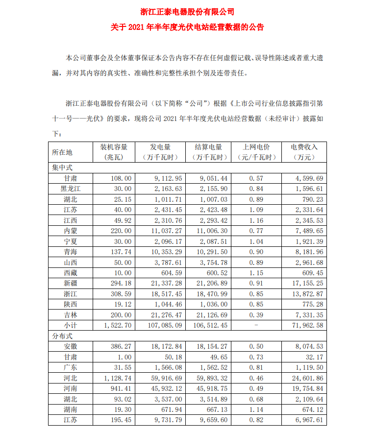持有電站6.55GW!正泰電器發布關于2021半年度光伏電站經營數據的公告