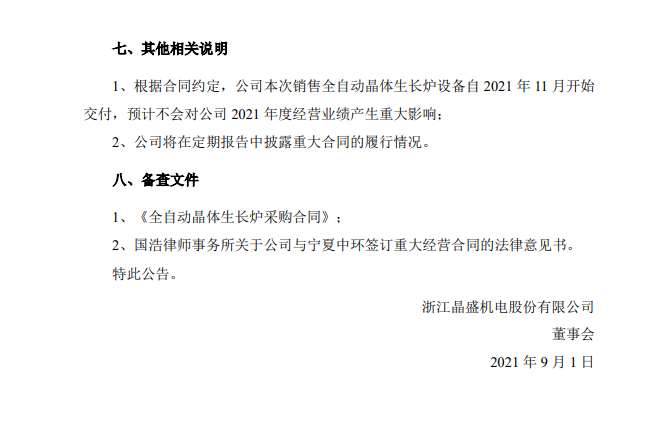 公告稱,8月31日,晶盛機電與寧夏中環簽訂《全自動晶體生長爐采購合同》,向寧夏中環銷售全自動晶體生長爐設備,合同金額 60.8256 億(含稅)。規定2021年11月開始設備交付,具體交付計劃以寧夏中環正式通知為準。